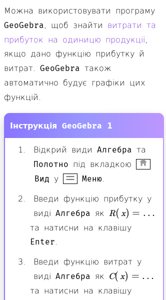 • Прибуток, витрати, витрати та прибуток на одиницю продукції в GeoGebra