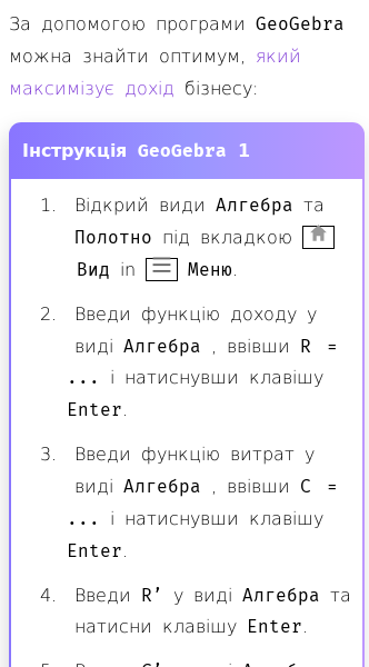 • Як знайти оптимум, який максимізує дохід бізнесу, за допомогою GeoGebra