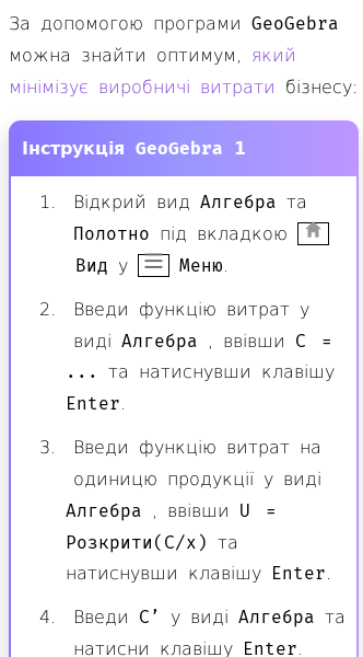 • Як знайти оптимум, який мінімізує виробничі витрати бізнесу, в GeoGebra
