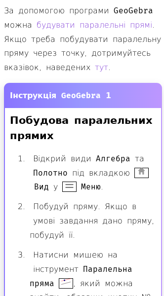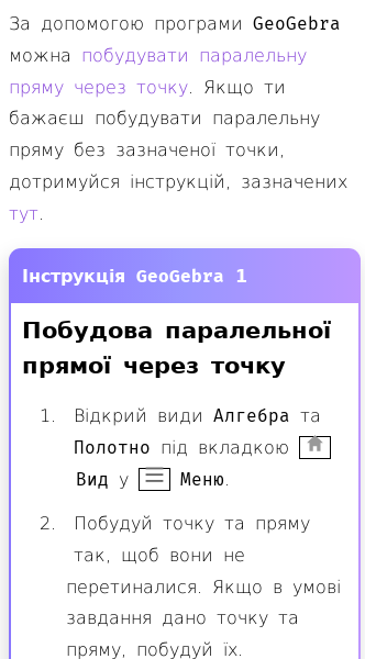 Стаття про Побудова паралельної прямої через точку в GeoGebra