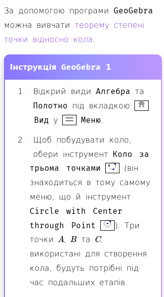 Стаття про Як вивчити теорему степені точки відносно кола в GeoGebra